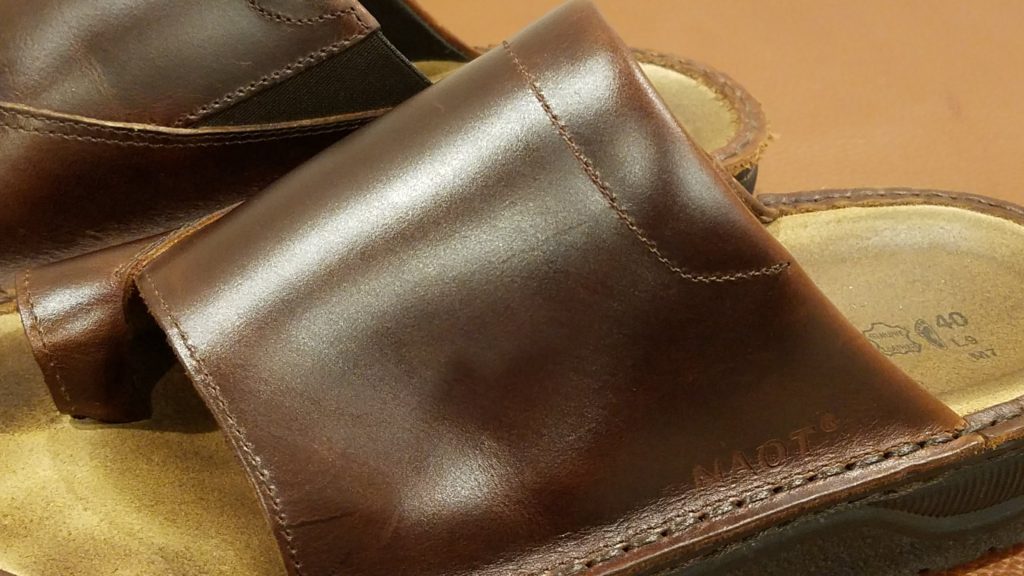 ケア後のサンダルがこちらです。また、履き始めて1か月経ったので経年劣化(エイジング)の様子をお伝えします。